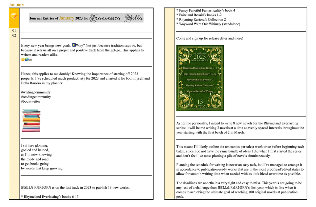 I’ve decided to devote this vlog entry to my biggest passion, writing, romance, and fantasy, and being productive beyond imagination, all which fuel each other. Next video, I intend to elaborate on why I write in the fantasy genre overall and this year I will also sprinkle about vlogs on the creation of my long-awaited debut novel, 𝕸𝖆𝖟𝖆𝖗𝖎𝖓𝖊 𝕯𝖗𝖊𝖆𝖒𝖊𝖗, my longest work written in rhyming couplets and illlustrated. As you can see, these are some pictures that went into the book specifically. These videos will elaborate on why one ought read in rhyme, what 𝕸𝖆𝖟𝖆𝖗𝖎𝖓𝖊 𝕯𝖗𝖊𝖆𝖒𝖊𝖗 is about, the characters, the art, the settings, and plethora more. So stay tuned and click on the link below to get a peek at 𝕸𝖆𝖟𝖆𝖗𝖎𝖓𝖊 𝕯𝖗𝖊𝖆𝖒𝖊𝖗 and these other novels productivity brings into being! It was and still is so worth all the hard work! Thanks for listening everyone here at the causerie circle! Remember that 𝔹𝔼𝕃𝕃𝔸 ℝ𝔸ℝ𝕀𝕆ℝ𝔸 makes a novel a month available for you to read. Ciao for now!